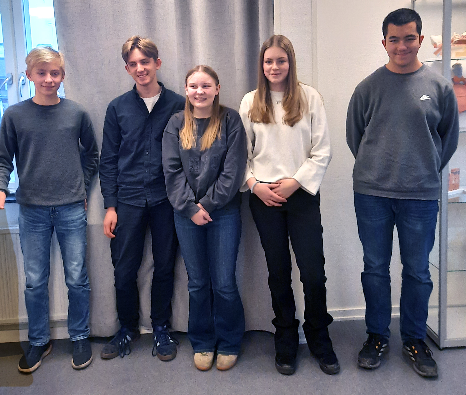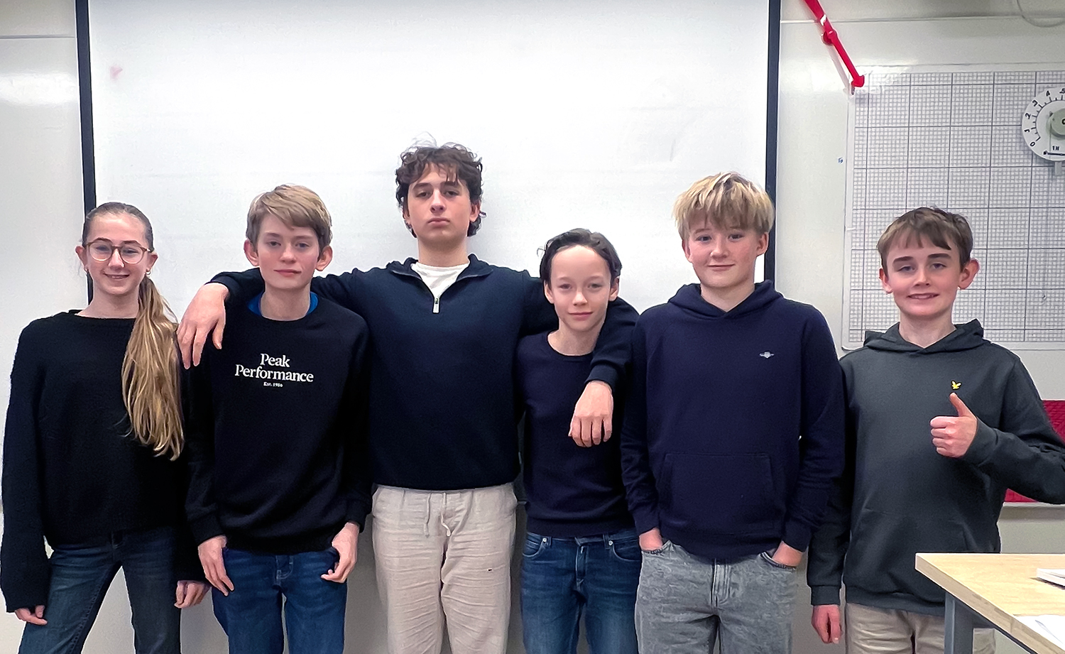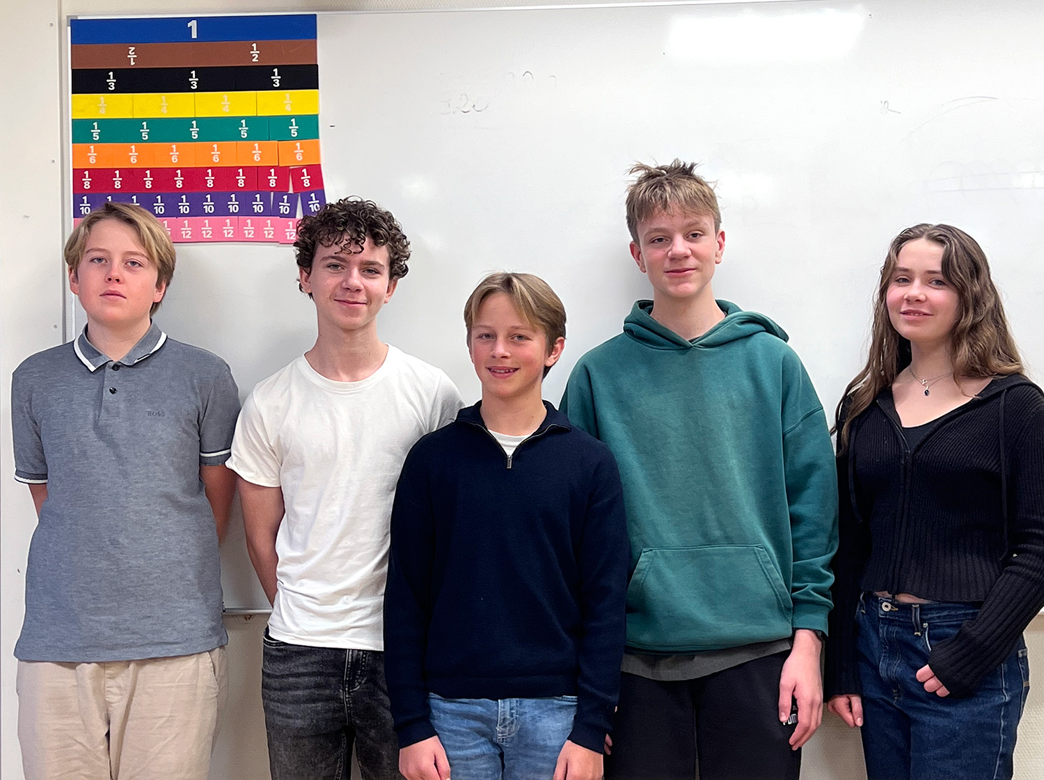Bästa resultat i årskurs 8s fick Elis (i mitten), följd av Malva (till höger) och Lucas, Axel och Alfred på delad tredjeplats.’