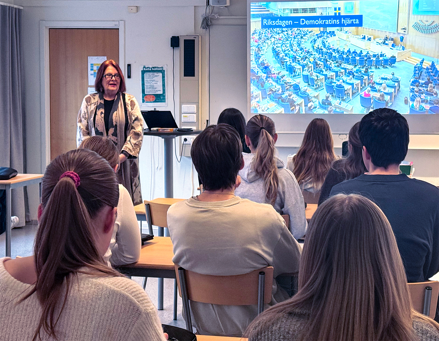 Lotta Johnsson Fornarve är sörmlänning och riksdagsledamot för Vänsterpartiet. Under ett besök på Europaskolan Rogge nyligen berättade hon om hur demokratin i vårt land fungerar och om sina olika uppdrag i riksdagen.