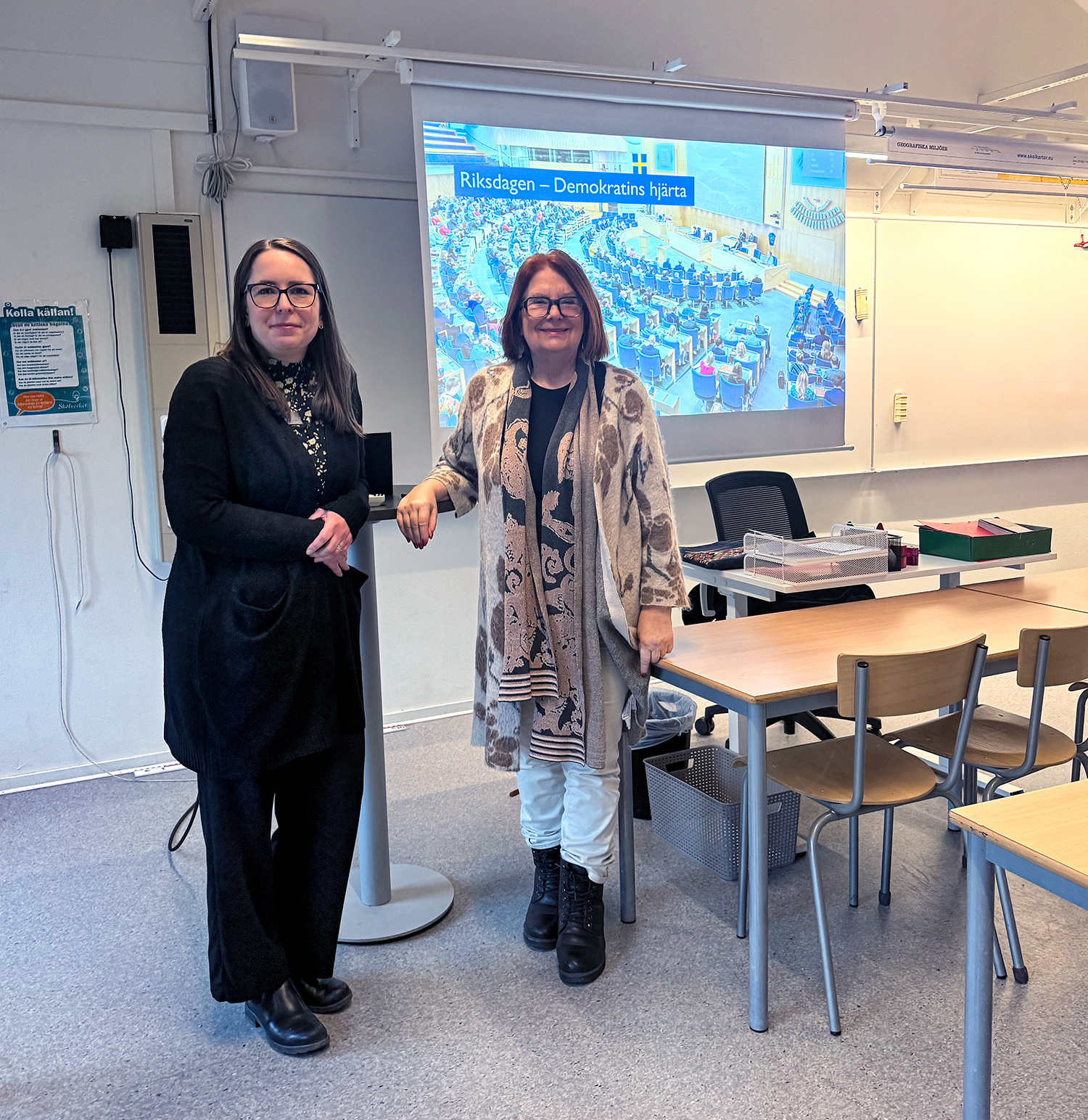 Lotta Johnsson Fornarve tillsammans med Madelene Dahlgren, lärare på spetsutbildningen i samhällskunskap på Europaskolan Rogge.