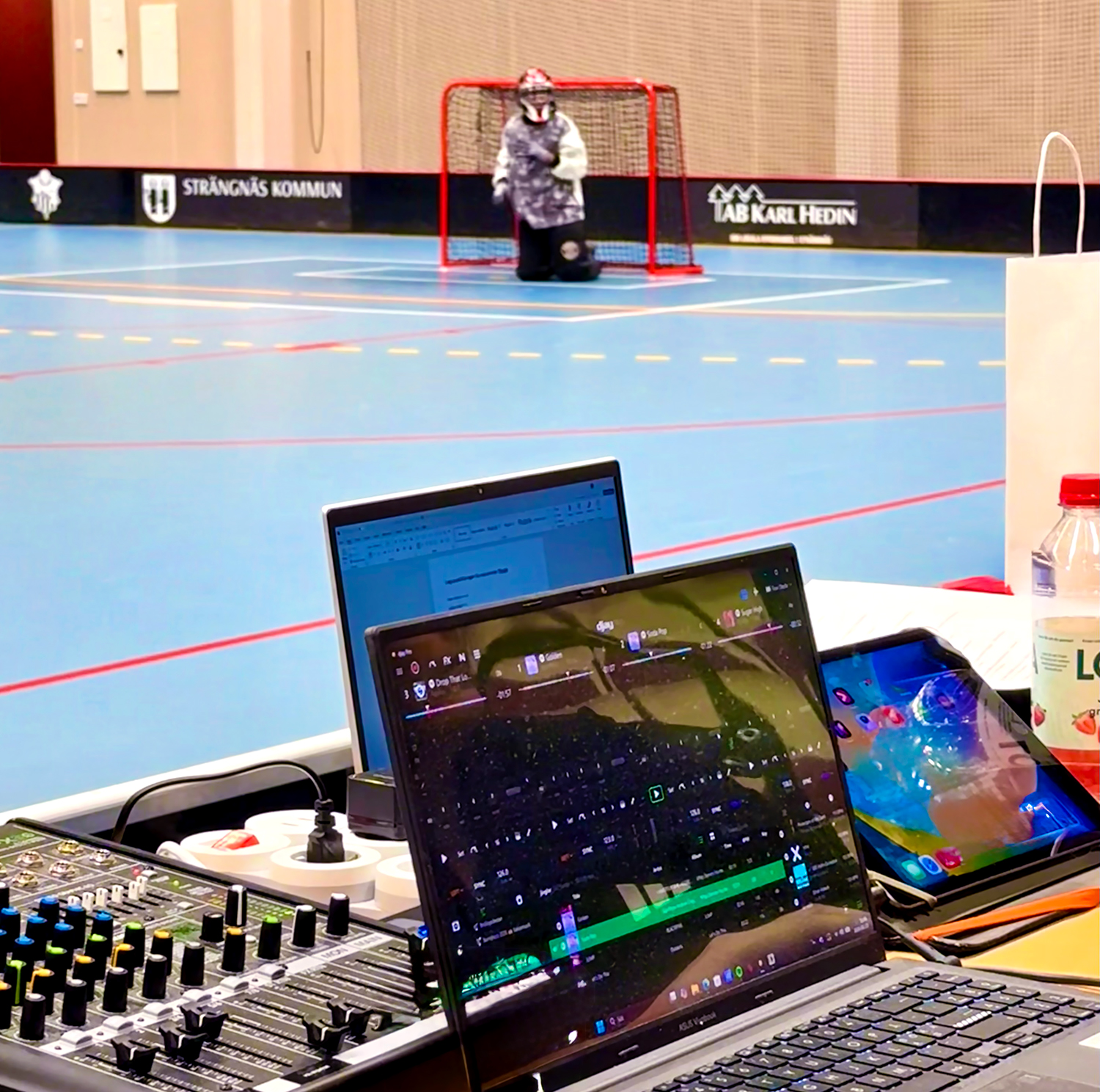 Det krävs en hel del teknik och effekter för att hålla igång publiken och skapa stämning under en innebandymatch.