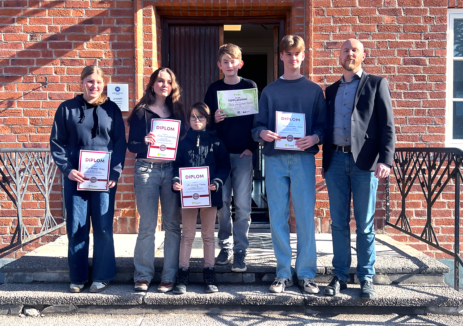 Från vänster ser vi fem finalister från Europaskolan Rogge som samtliga gjorde bra ifrån sig i den nationella matematiktävlingen Pangea. Finalisterna var Nina Havland (årskurs 7), Malva Lindblad (årskurs 8), Mix Eriksson (årskurs 4), Felix Lärnestad (årskurs 7) och Viktor Lidholm (årskurs 9). Längst till höger ser vi Europaskolan Rogges rektor Christoffer Bergfors.