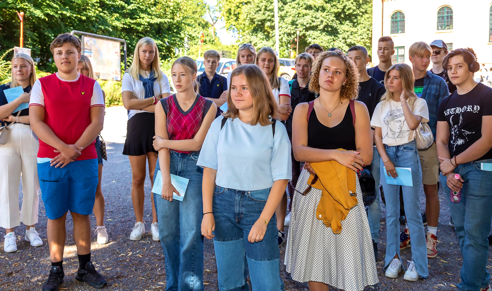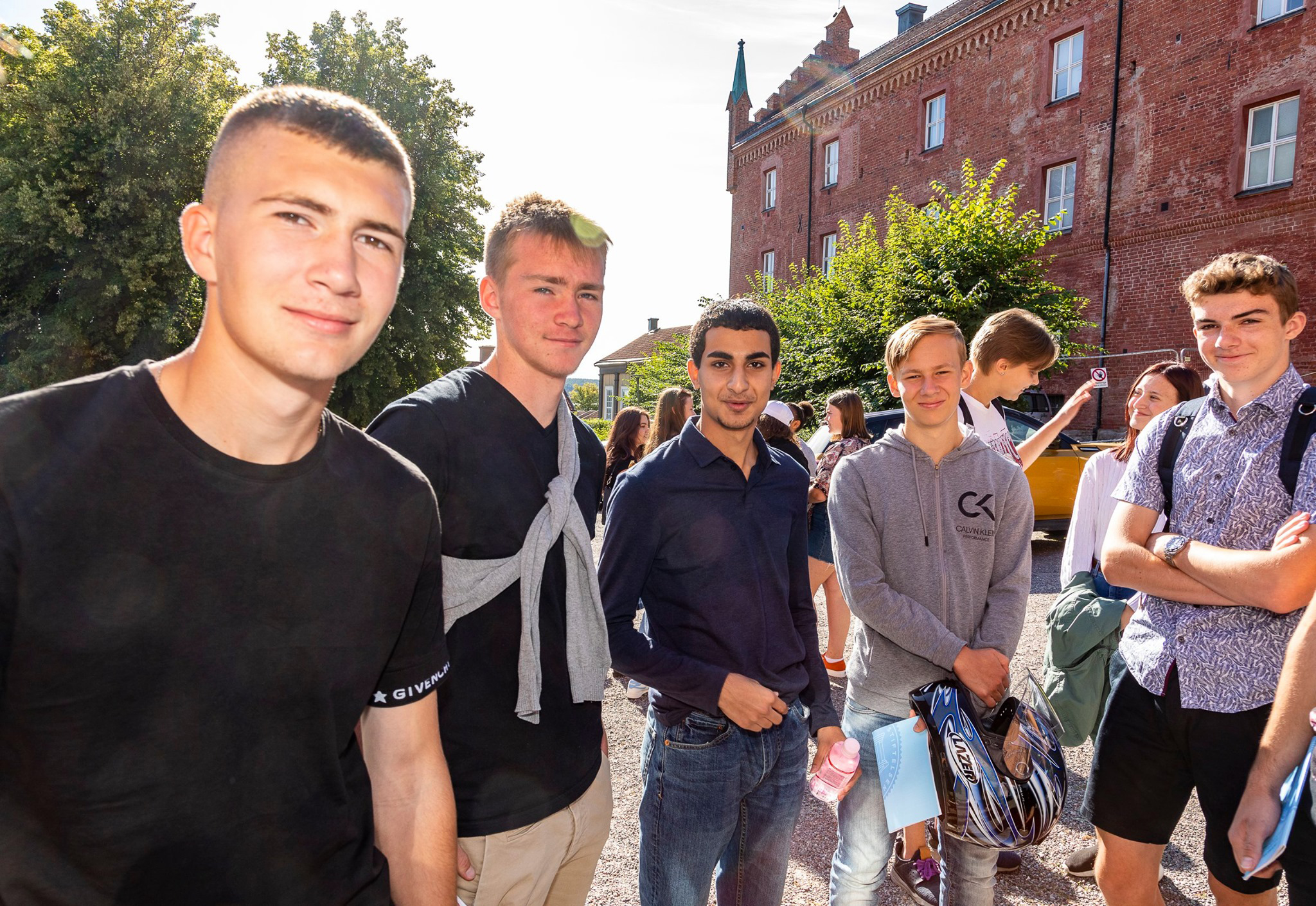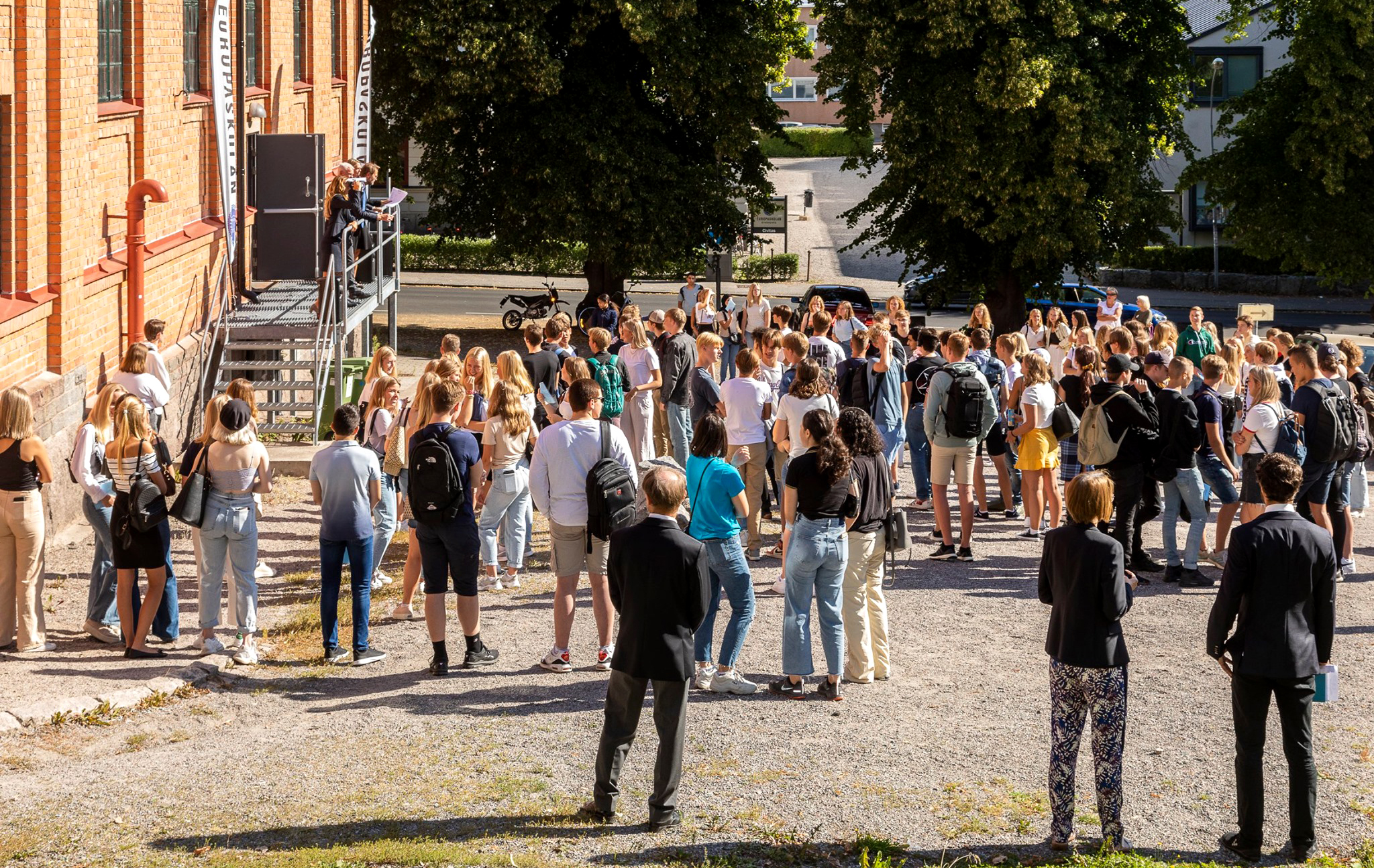 Efterhand samlades eleverna utanför Djäknehallen, skolans aula, som ligger i den mer än 100 år gamla Djäknegården. I vanliga fall samlas vi inne i själva aulan men nu var det inte möjligt, på grund av den rådande pandemin. I stället fick eleverna mingla på Roggeplan, med tydliga anvisningar om minimiavstånd för att begränsa eventuell smittspridning.