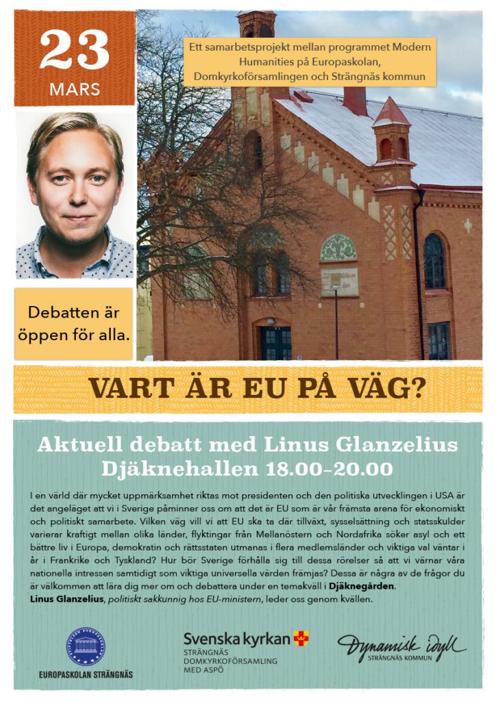 Vi träffas i Djäknehallen, klockan 18.00–20.00, torsdagen den 23 mars. leder oss genom temakvällen som är ett samarbete mellan programmet Modern Humanities på Europaskolan Strängnäs, Domkyrkoförsamlingen och Strängnäs kommun.
