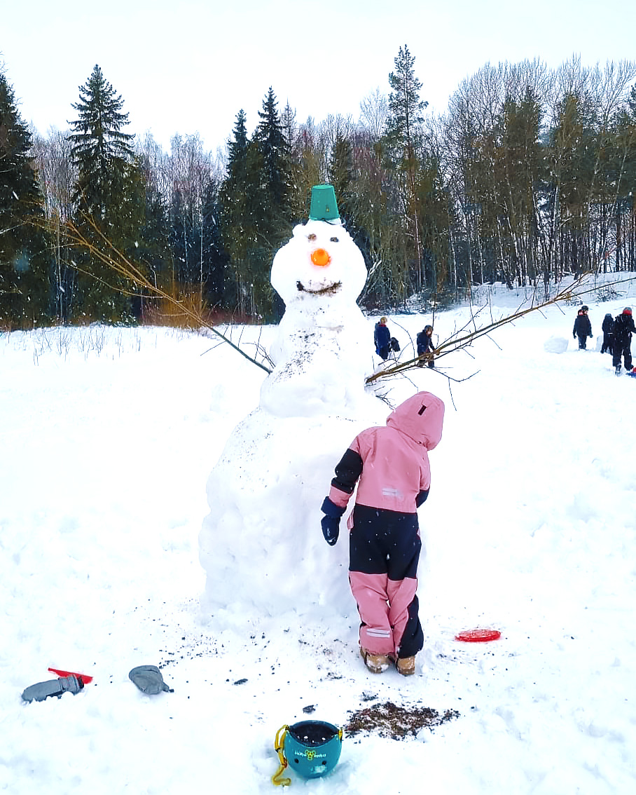 Barnen på Europaskolan Vårfruberga visar stor kreativitet när snögubbarna utsmyckas.