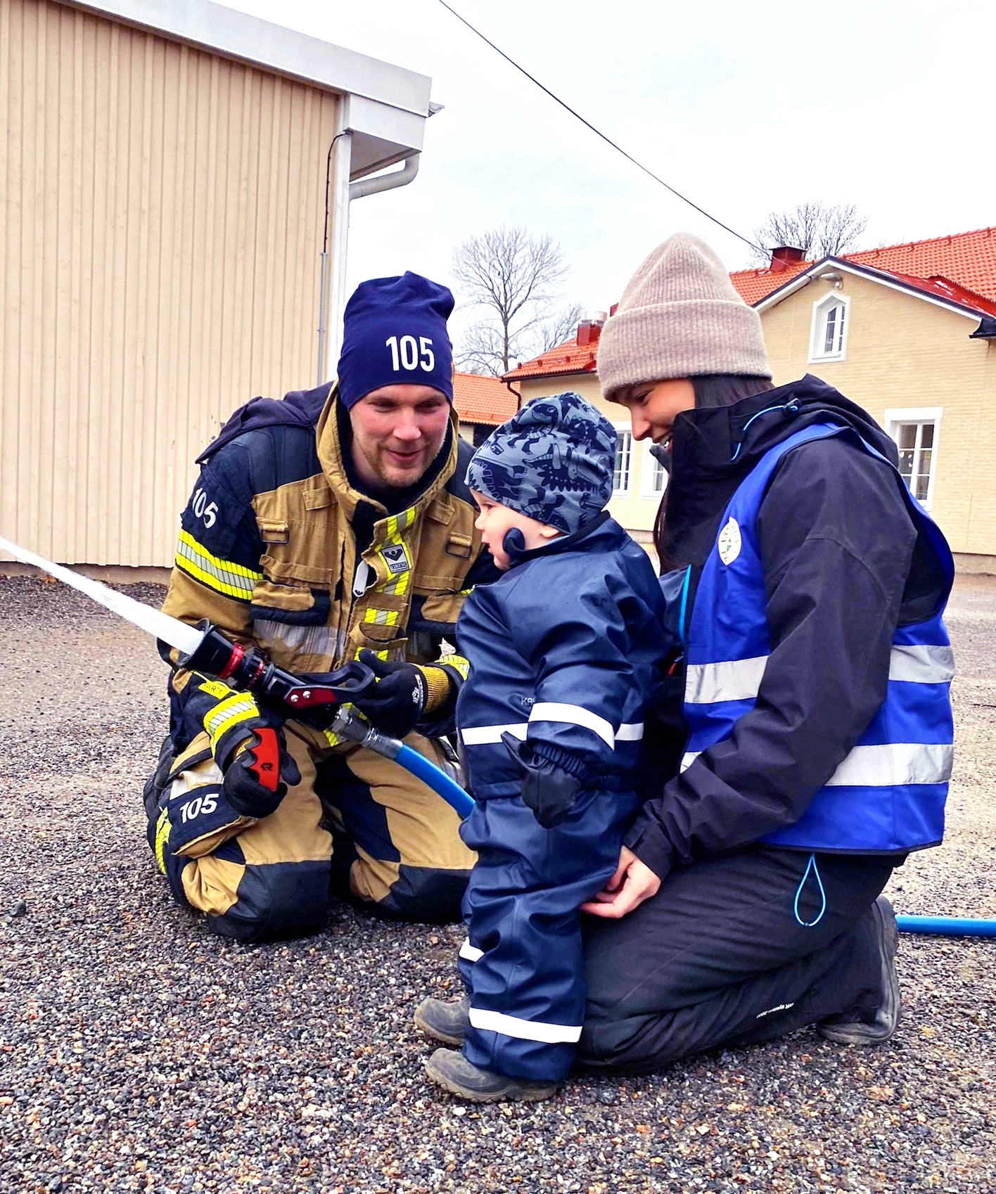Leon tillsammans med förskolläraren Neira fick prova på att spola vatten med brandslangen.